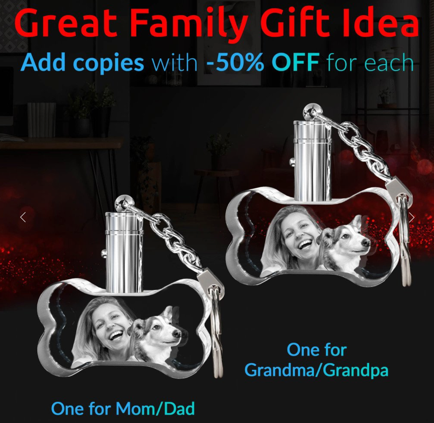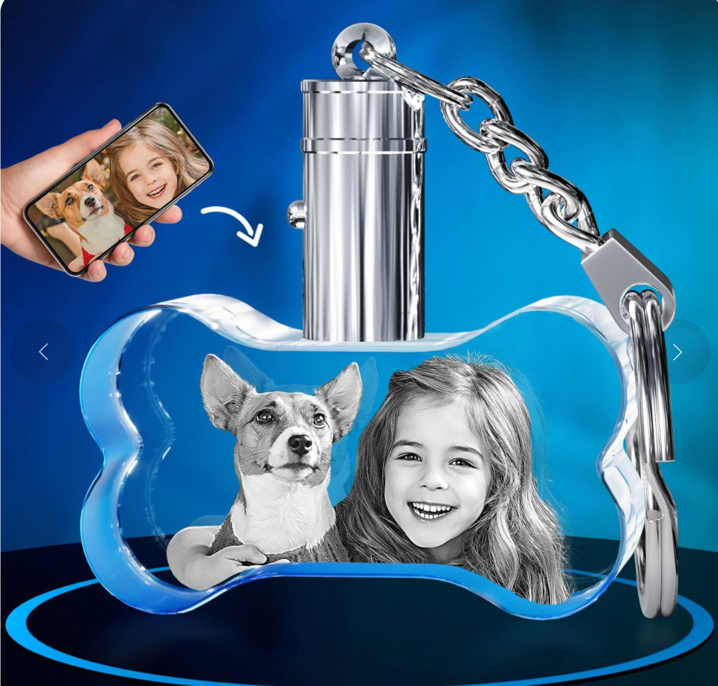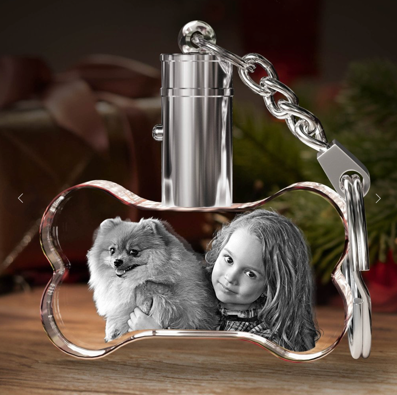 Carry the love of your fur friends everywhere you go with our 3D crystal dog bone keychain. Simply pick out a favorite photo with your pet and we will get it etched onto high-quality dog bone-shaped crystal along with any special name, date, or message. This keychain also makes for the perfect gift for a friend or family member who misses their dog when away from home. Never miss a moment with your pets when they’re always close to you with our personalized 3D dog bone keychains.